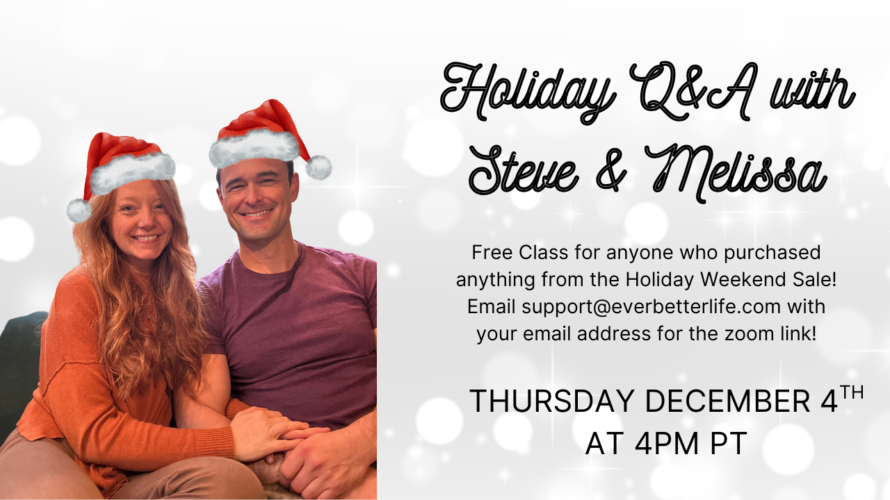 Join Dr. Melissa & Steve this Thursday, December 4th at 4pm PT for an open Q&A on any topic. Email [email protected]Â with your purchase info to get the zoom link.